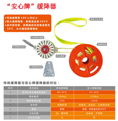 《發(fā)明夢工廠》欄目報道的“安心牌”自冷卻式緩降器,采用自冷卻技術(shù),使產(chǎn)品更加安全可靠,是高層住宅必備的逃生產(chǎn)品。該產(chǎn)品可連續(xù)營救100人次以上,防火緩降繩索耐高溫可達(dá)到560℃,自冷卻功能控制繩體及設(shè)備溫度在50℃左右,適用于200米以下高層逃生,獲山東省名牌產(chǎn)品、山東省安全生產(chǎn)科學(xué)技術(shù)進(jìn)步二等獎,入選國家安全生產(chǎn)“千項”產(chǎn)品推廣目錄,填補(bǔ)了國內(nèi)空白,達(dá)到國際先進(jìn)水平。