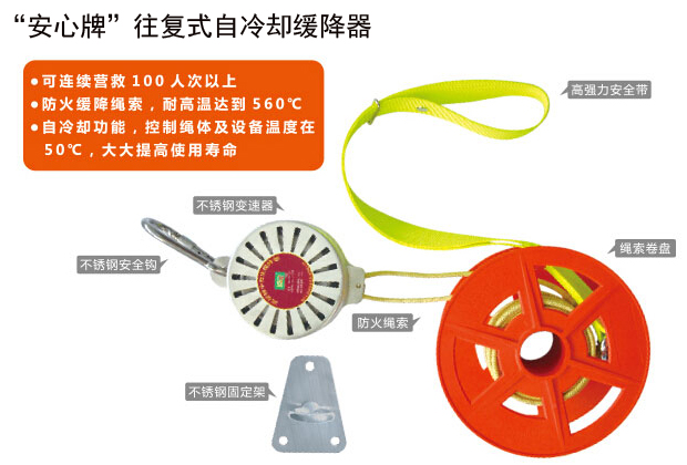 面對市場上各類不同層次的緩降器,很多人在購買時往往無從下手,不知道應該如何選擇。俗話說的好“一分錢一分貨”,面對這類救命的產品,不能貪圖小便宜。要買就必須要購買擁有專利保障的產品。“安心牌”往復式緩降器唯一專利產品,產品本身榮獲多項發明專利。與普通緩降器相比,防火緩降繩索耐高溫可達到560℃,自冷卻功能控制繩體及設備溫度在50℃左右,破強力達2000kg。