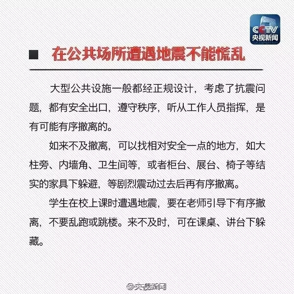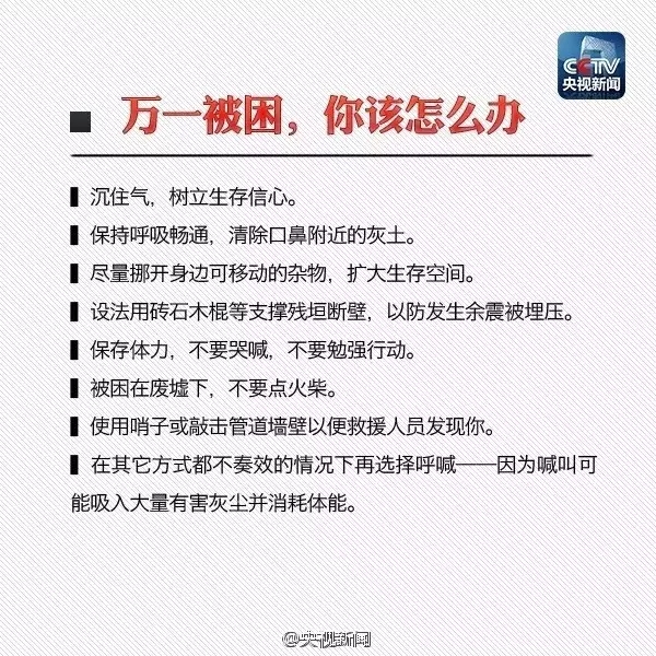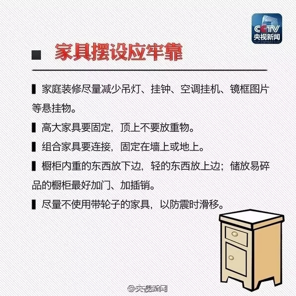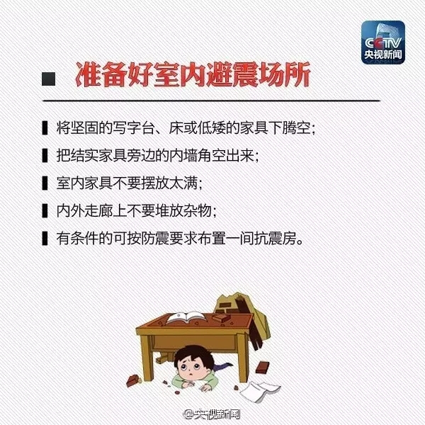 “寧可千日不震,不可一日不防”。災(zāi)難一旦發(fā)生,生死存亡就在瞬息之間。所以,日常生活中應(yīng)當(dāng)學(xué)習(xí)、掌握應(yīng)急避震知識,準(zhǔn)備地震應(yīng)急包,萬一遭遇強(qiáng)震,就能減少自己和家人的生命危險(xiǎn)。