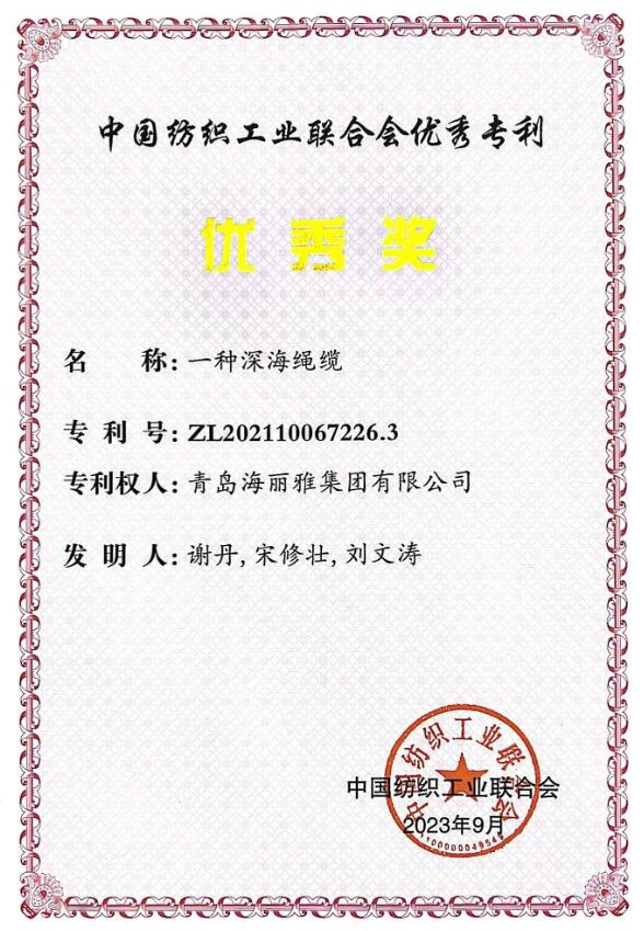 青島海麗雅集團深海繩纜榮獲中國紡織工業聯合會優秀專利獎!