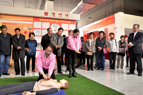揭牌儀式開始前,出席儀式的嘉賓們還參觀了海麗雅集團應急安全教育培訓中心和產品展廳,觀看了企業發展宣傳片。在培訓中心,恰逢青島市北仲路第一小學的學生正在爭先恐后的體驗高層緩降、煙霧走廊逃生、模擬地震,學習消防滅火、結繩自救、醫療急救等知識,體驗現場異常熱鬧。孩子們學習的津津有味、不亦樂乎。徐長聚主任在饒有興趣的看著孩子們學習體驗場景的同時,不住的點頭稱贊:企業面向青少年應急安全教育事業,實在了不起;他指出,“生命誠可貴,安全必相隨”,對集團研發的高品質惠民應急產品給予肯定。他同時鼓勵企業要永不滿足,致力創新,在關心下一代工作方面有所作為,在爭創國際知名品牌道路上不斷前行。