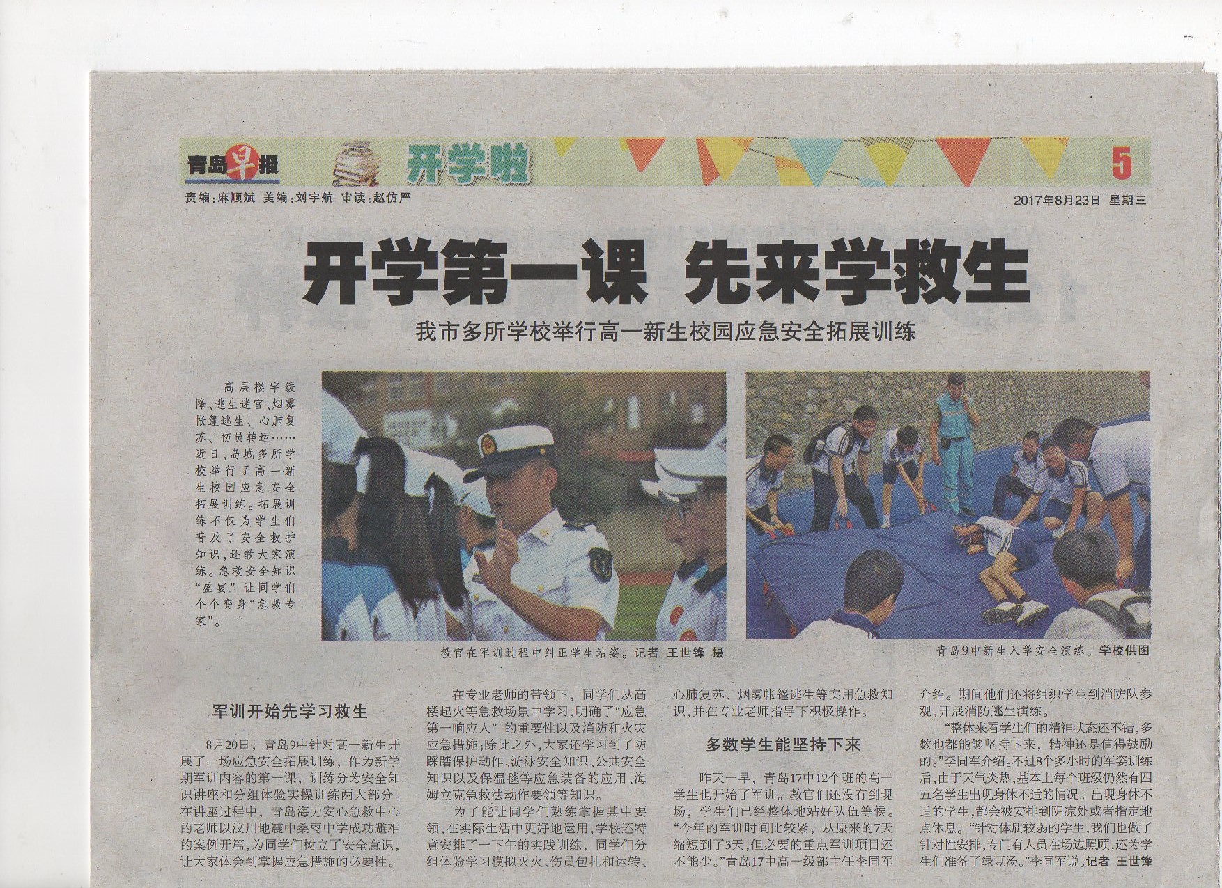 2017年8月23日,青島早報對海麗應急安全中心為青島第九中學的新生及老師進行培訓活動進行報道