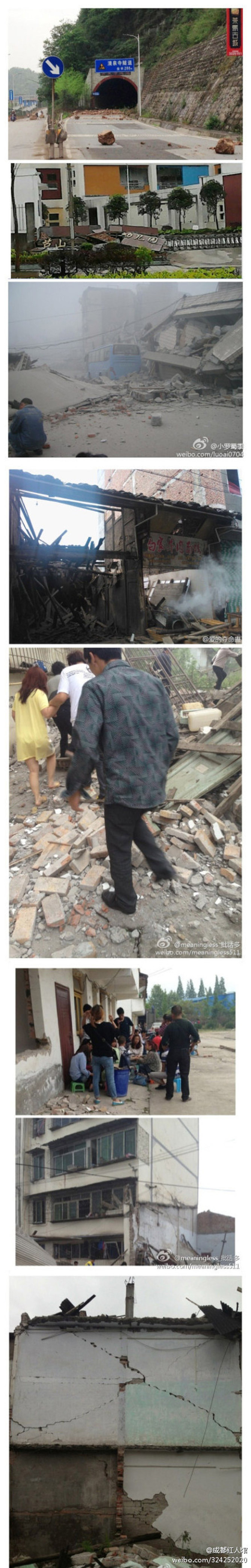 據四川省人民政府新聞發布會通報,四川全省受損的公路達2986公里、橋梁327座、變電站24座、輸電線路224條,固定和移動通信基站損毀724座、通信中斷鄉鎮16個,城鄉居民住房倒塌26411間、嚴重損壞142449間,受損水庫214座,受損堤防118.54千米。寶興縣通信全阻,天全縣、蘆山縣通信大面積中斷,通往阿壩、雅安的三條光纜環中斷。