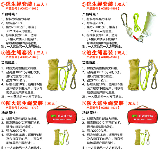 緩降逃生繩是在高空作業出現危急情況下,自我(單人)緩降逃生時使用。只有經過專業培訓后才可使用。建議您每月至少一次使用該產品進行逃生練習,以達到最佳使用效果在練習中,必須配備一個獨立的保護系統。